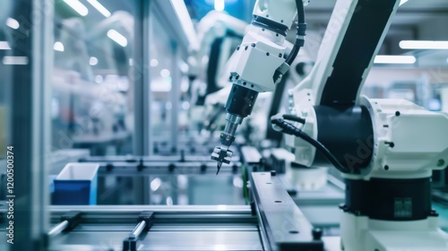 An expansive industrial robotics manufacturing plant with robotic arms assembling precision machinery parts under controlled factory conditions, Robotics manufacturing plant scene