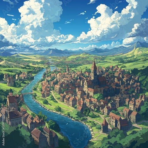An expansive landscape reveals a medieval town and flowing river under a sky