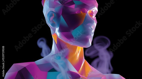 An experimental digital artwork featuring a surreal, visionary expression of an abstract human form composed of overlapping layers of colorful smoke and dynamic geometric shapes.