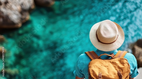 An explorer wearing a hat and an orange backpack stands beside rocky terrain next to a stunningly clear blue sea, embodying adventure and the uncharted paths.