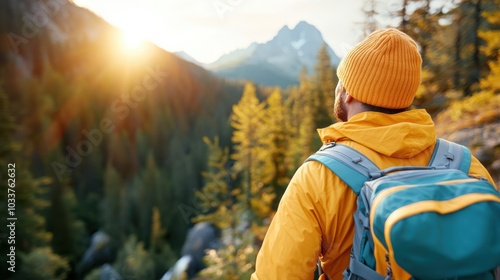 An explorer, wearing an orange-yellow outfit, stands captivated by a sun-drenched forest path leading towards distant mountains, illustrating exploration and serenity.