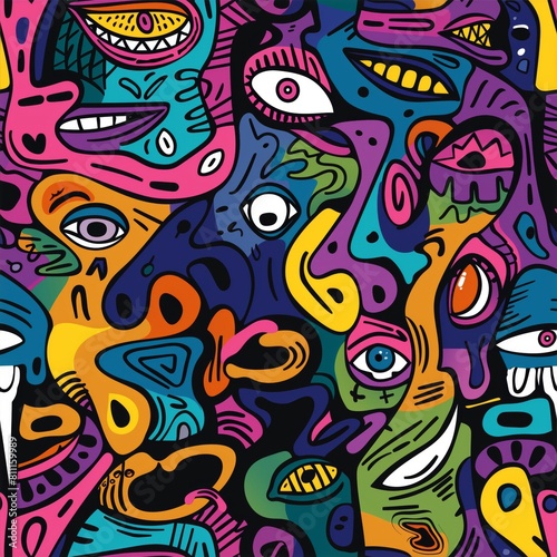 An explosion of colors and faces creates a seamless pattern that stands out for its creativity and expression of human emotions