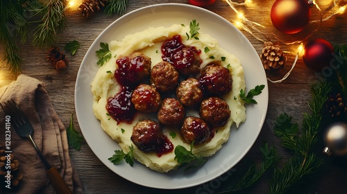 An Exquisite Arrangement of Swedish Meatballs with Lingonberry Jam and Creamy Mashed Potatoes Set Against a Rustic Holiday Theme