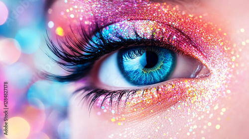 An exquisite portrayal of an eye, beautifully detailed to encapsulate an entire universe within its gaze, accentuated by a constellation of vibrant colors and cosmic elements, symbolizing infinite pot
