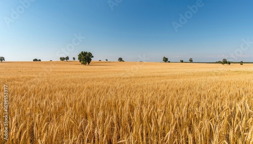 An extensive golden wheat expanse reaches the horizon beneath a bright blue sky, with sporadic trees enhancing the view.