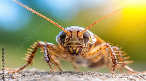 An extreme close-up of a cockroach emphasizing its detailed features, showcasing the often-overlooked beauty and complexity of these insects in their natural form.