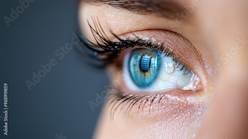 An extreme close-up of a person's blue eye, capturing the fine details of the iris, veins, and dark eyelashes, bringing forth a sense of realism and wonder.