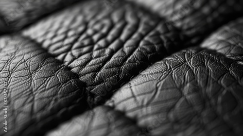 An extreme close-up shot showing the detailed texture and pattern of black leather upholstery, emphasizing the intricate stitching and quality of the material.