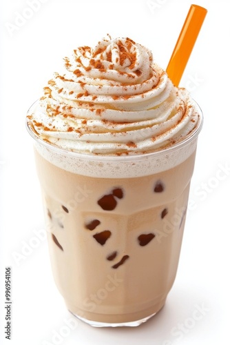An iced coffee caramel macchiato isolated on a transparent background.