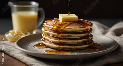 An icon featuring a stack of pancakes with syrup drizzled over them and a pat of butter on top, presented in a charming style.