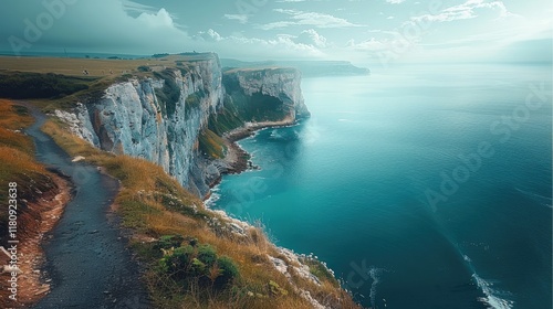 An idyllic coastal cliff overlooking the ocean, with a winding path leading to the edge. with the vastness of the sea and sky.