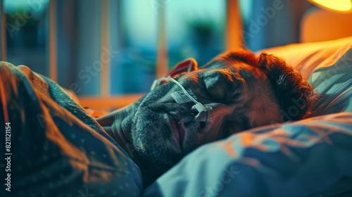 An ill man is asleep on the bed in the hospital, wearing a nasal cannula to breathe. This is an example of a terminally ill man as he struggles to breathe.