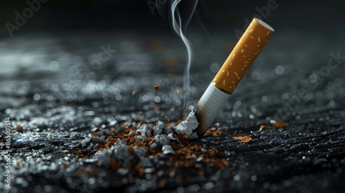 An illegal illustration of a cigarette falling on a rough black floor
