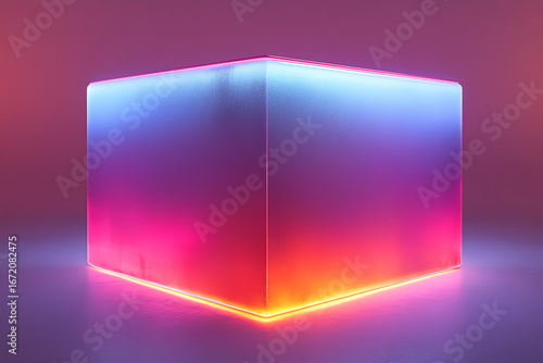 An illuminated cube featuring vibrant neon colors, creating a striking visual effect in a modern setting.