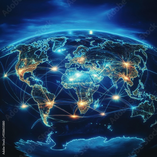 An illuminated globe showcasing global connections and network communications in vibrant blue hues.