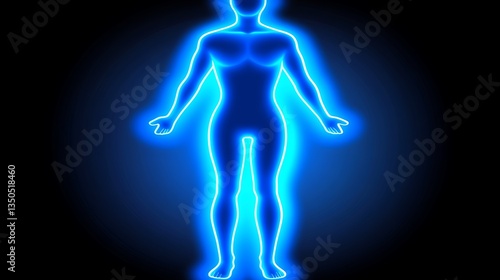 An illuminated human form displayed against a dark background in blue