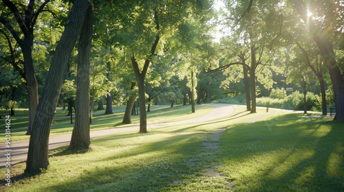 An illuminated, inviting park pathway, dappled with sunlight through lush trees, suggests a peaceful escape into nature.
