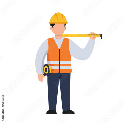 An illustration of a construction worker, wearing a hard hat and safety vest, holding a measuring tape, symbolizing precision and safety in building.