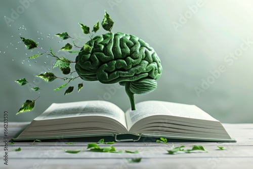 An illustration of a human brain flourishing with green leaves, sprouting from the pages of an open book
