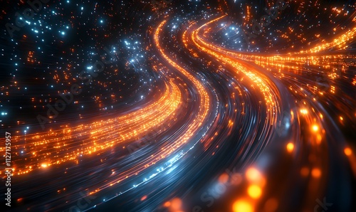 An illustration of high-speed data streams moving through glowing network lines