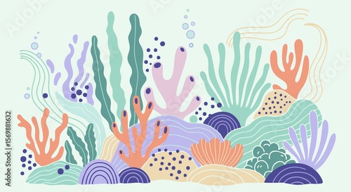 An illustration of stylized coral and seaweed in pastel colors, creating an underwater scene.