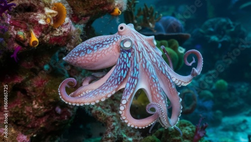 an illustration of the common octopus (Octopus vulgaris), focusing on its distinctive characteristics and wildlife presence