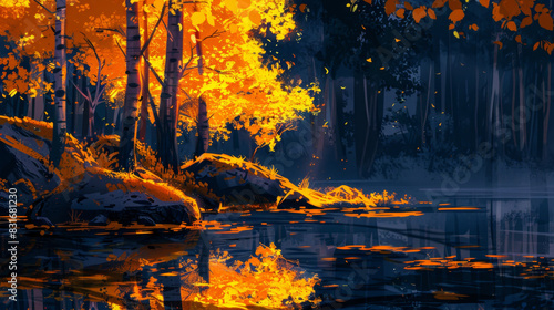 An illustration of yellow trees and rocks in the forest in the style of river, digital art style, vibrant oil painting, dark background, yellow color tone
