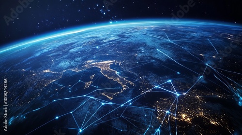 An illustration representing communication technology for internet business, showcasing a global network of telecommunication connections across the Earth.