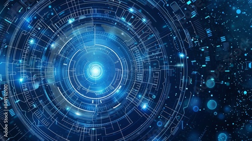 An illustrative digital concept showing a blue futuristic technology interface with complex circular designs and glowing elements