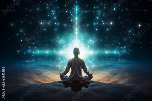An image depicts a man meditating alone in the midst of an astral and spectral environment. This scene captures his serene connection with a surreal and otherworldly realm.