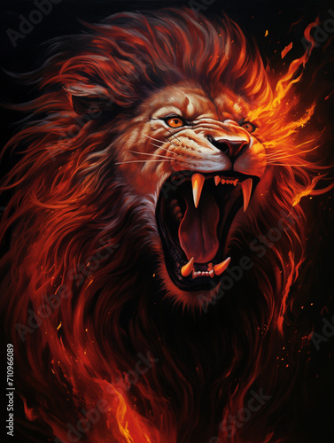 An image of a lion roaring, its mane made up of flames, in the style of symbolic realism created with Generative Ai