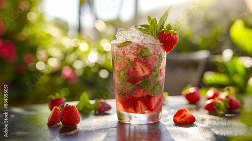 An image of a strawberry basil mojito, vibrant red and fresh, served in a glass with crushed ice and garnished with fresh strawberries and basil leaves