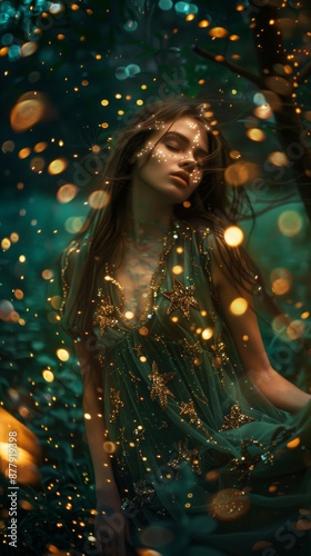 An image of a whimsical woman adorned in a green dress, enveloped by magical, glowing lights. The setting evokes fantasy, wonder, and a deep connection with nature's mystique.