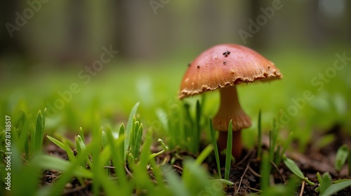 An image where the lighting is soft and natural, highlighting the contrast between the mushroom's colors and the green of the grass
