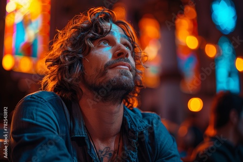 An individual in a bar setting with vibrant neon lights creates a mood of contemplation and nightlife ambiance