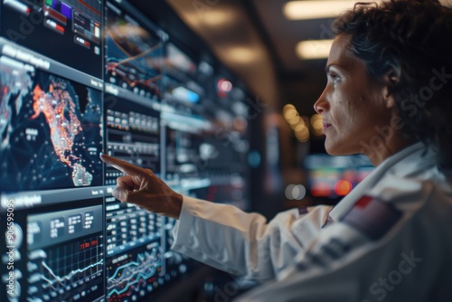 An individual is deeply involved with analyzing and studying data on an expansive digital screen, suggesting a high degree of technological proficiency and information processing.