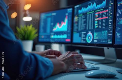 An individual is focused on data analysis using several screens in a contemporary office setting at dusk