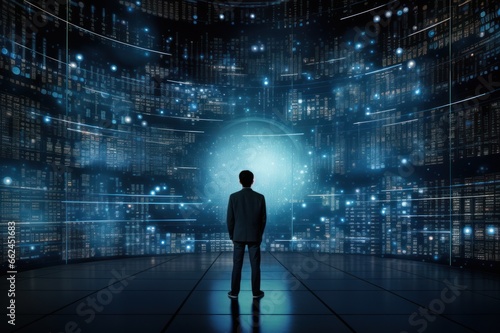 An individual positioned before an immense data display. Emphasizing the concept of data and analytics, encompassing data visualization, analytical instruments, and data centers