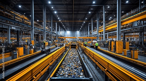 An industrial factory with a conveyor belt system. Workers are moving between the belts in the factory.