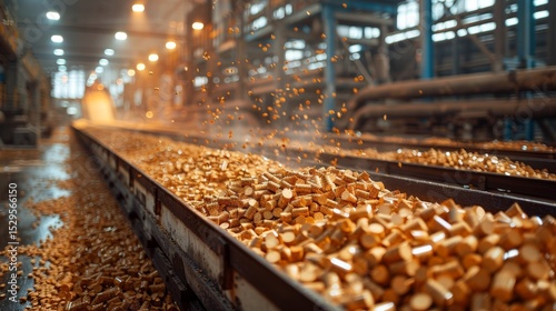 An industrial scene showcasing wood chips cascading along a conveyor belt, representing efficiency and production in the lumber industry, alongside the interplay of machinery and natural resources.