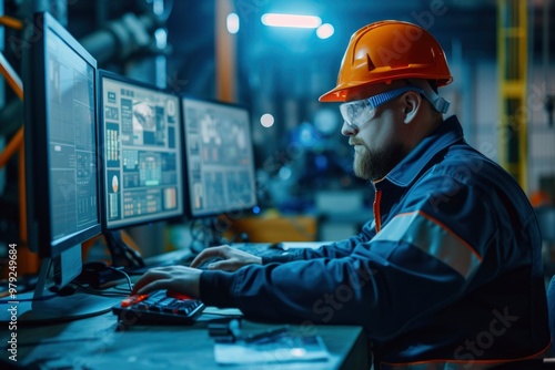 An industrial worker wearing a hardhat and safety goggles monitors systems on a computer in a factory setting.