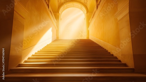 An inspiring image of a grand golden staircase rising against a soft, luminous background, capturing the essence of ambition and the celebration of accomplishments as it ascends toward the unknown.