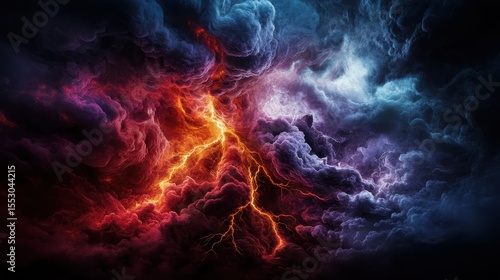 An intense and dramatic display of storm clouds filled with vibrant colors and flashes of lightning captures the raw power and beauty of nature's phenomena.