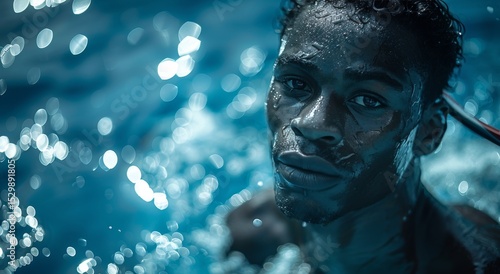 An intense portrait of a swimmer immersed underwater, capturing the essence of focus, determination, and the beauty of movement in a tranquil aquatic environment.