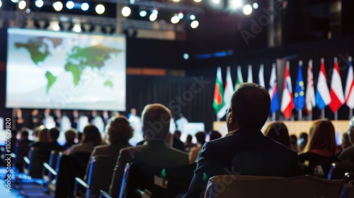 An international business conference with diverse speakers, audience interactions, and high-tech presentation tools in a grand event hall
