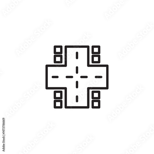 An intersection icon shows two perpendicular roads with dashed center lines. Stylized buildings or blocks are located at each of the four corners of the intersection.