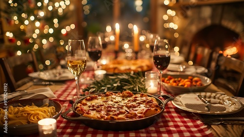 An intimate Italian dinner party, long table with red checkered tablecloths, a spread of pasta dishes and wine, guests enjoying a meal in a cozy setting, soft warm lighting,