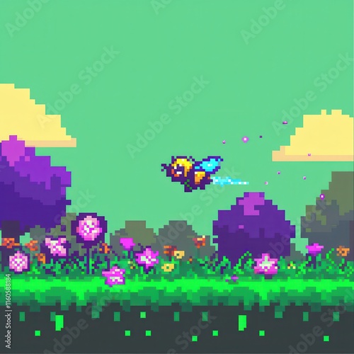 An intricate 8-bit pixel art of a glowing pixelated bee buzzing around pixelated flowers, with glowing trails and tiny sparkling petals, set on a pastel yellow and green background for a cheerful