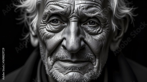 An intricate black and white portrait of an elderly man with deep wrinkles, highlighting character and emotion through shadows and contrast.