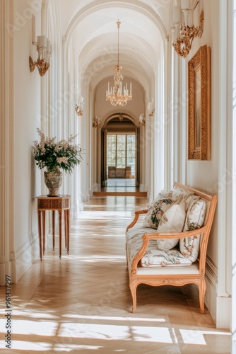 An intricate Chinoiserie settee adorned with embroidered cushions, positioned in a grand hallway, epitomizing furniture luxury and classic elegance.